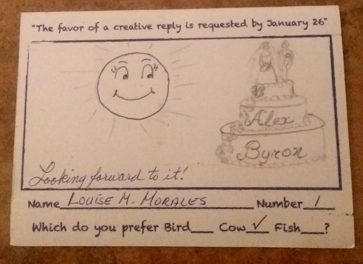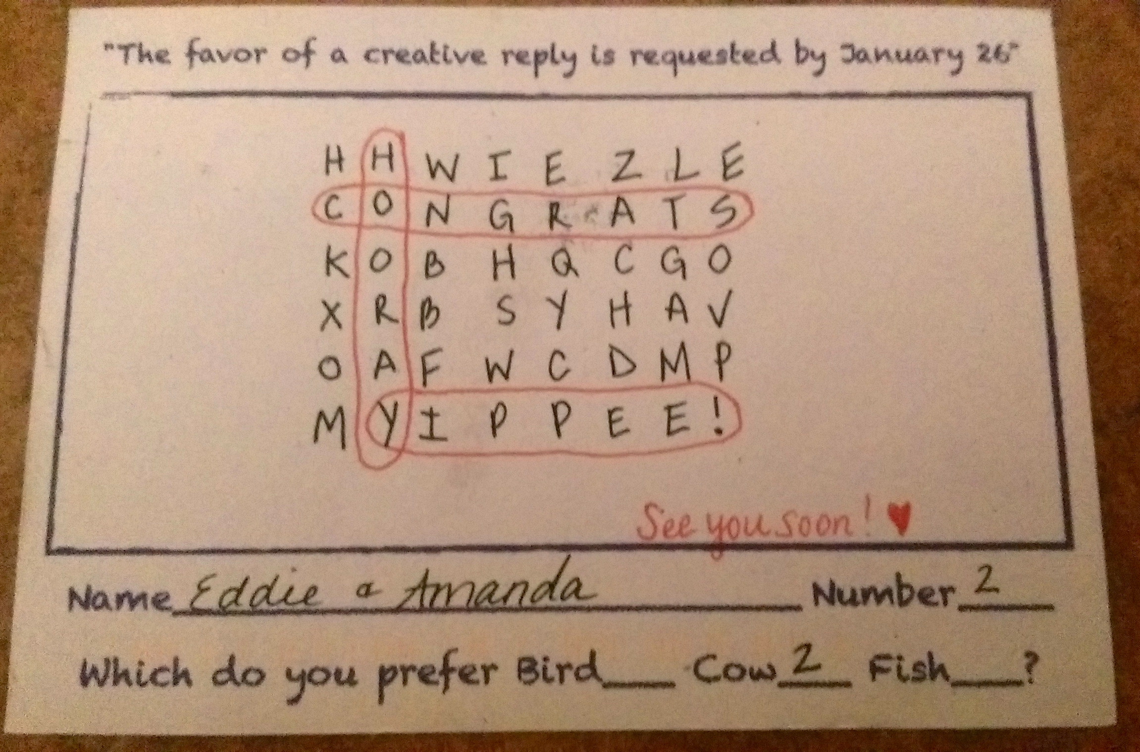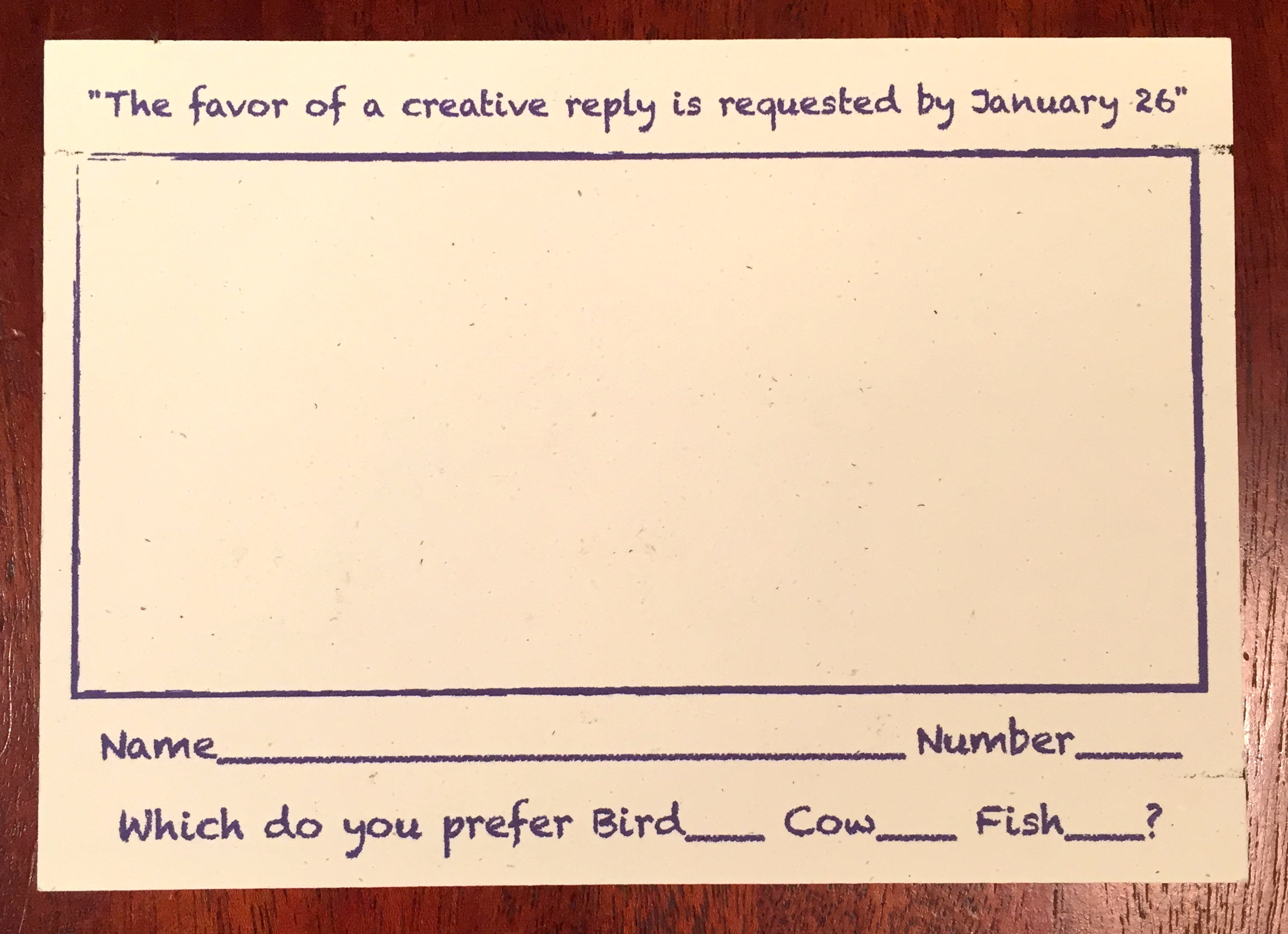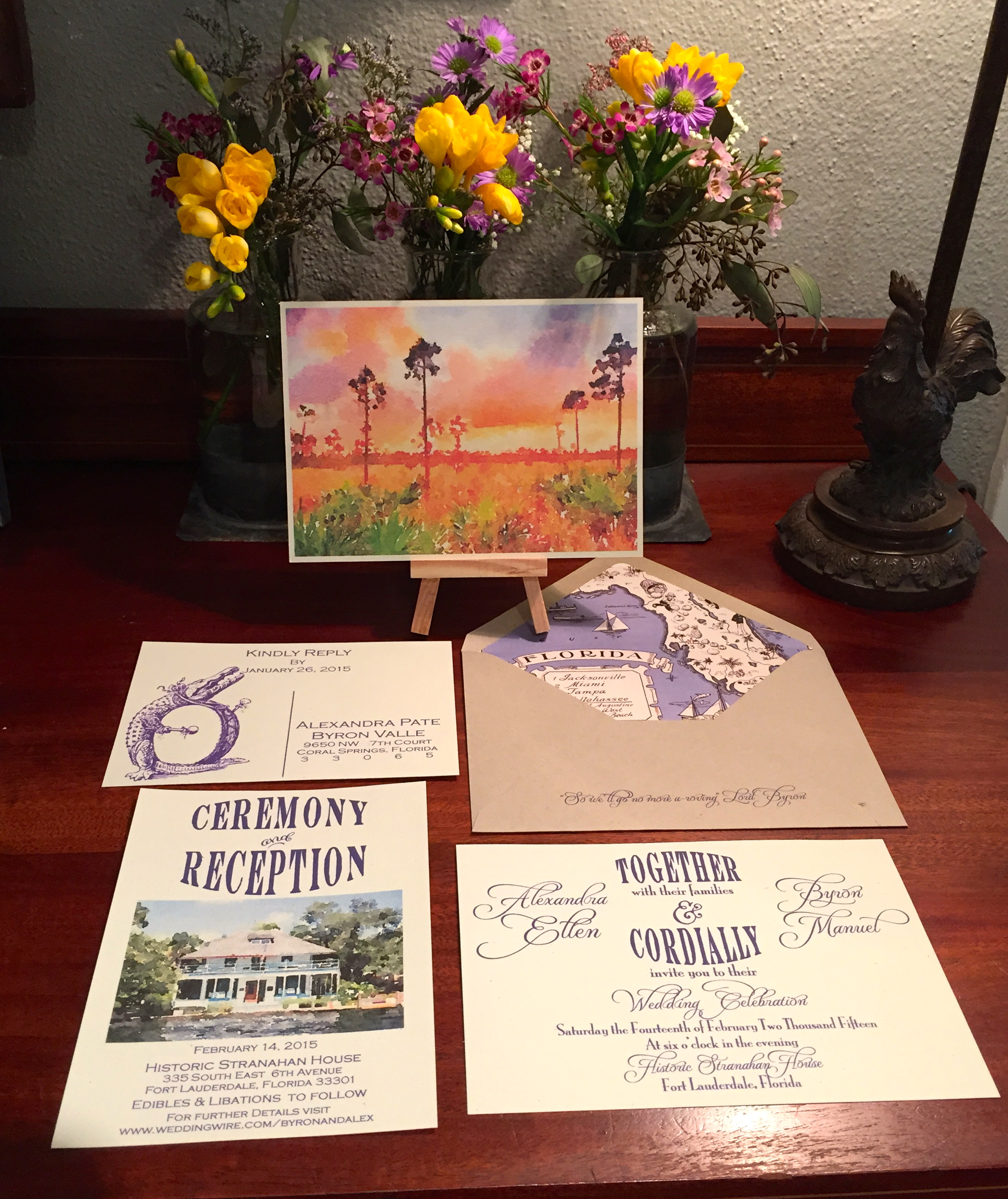When having difficulty deciding on the illustration for the reverse side of the invitation we decided on using two of their favorites… half would be printed with the everglades gator and the other half using of the glorious Florida sunset, problem solved. Also included a details card with an illustration of the venue and a super fun RSVP post card…Alex and Byron have some very clever friends! You’ll get a smile on your face when you see their reply cards. The envelope is lined with a vintage Florida map in purple of course. Digital caligraphy addressing and a favorite quote of the bride and groom on the back of the envelope. “So, we’ll go no more a roving” Lord Byron