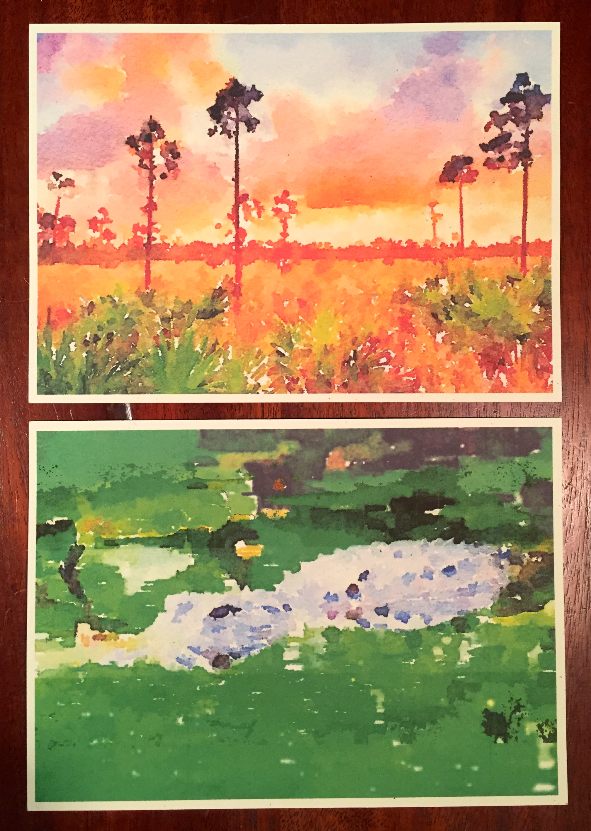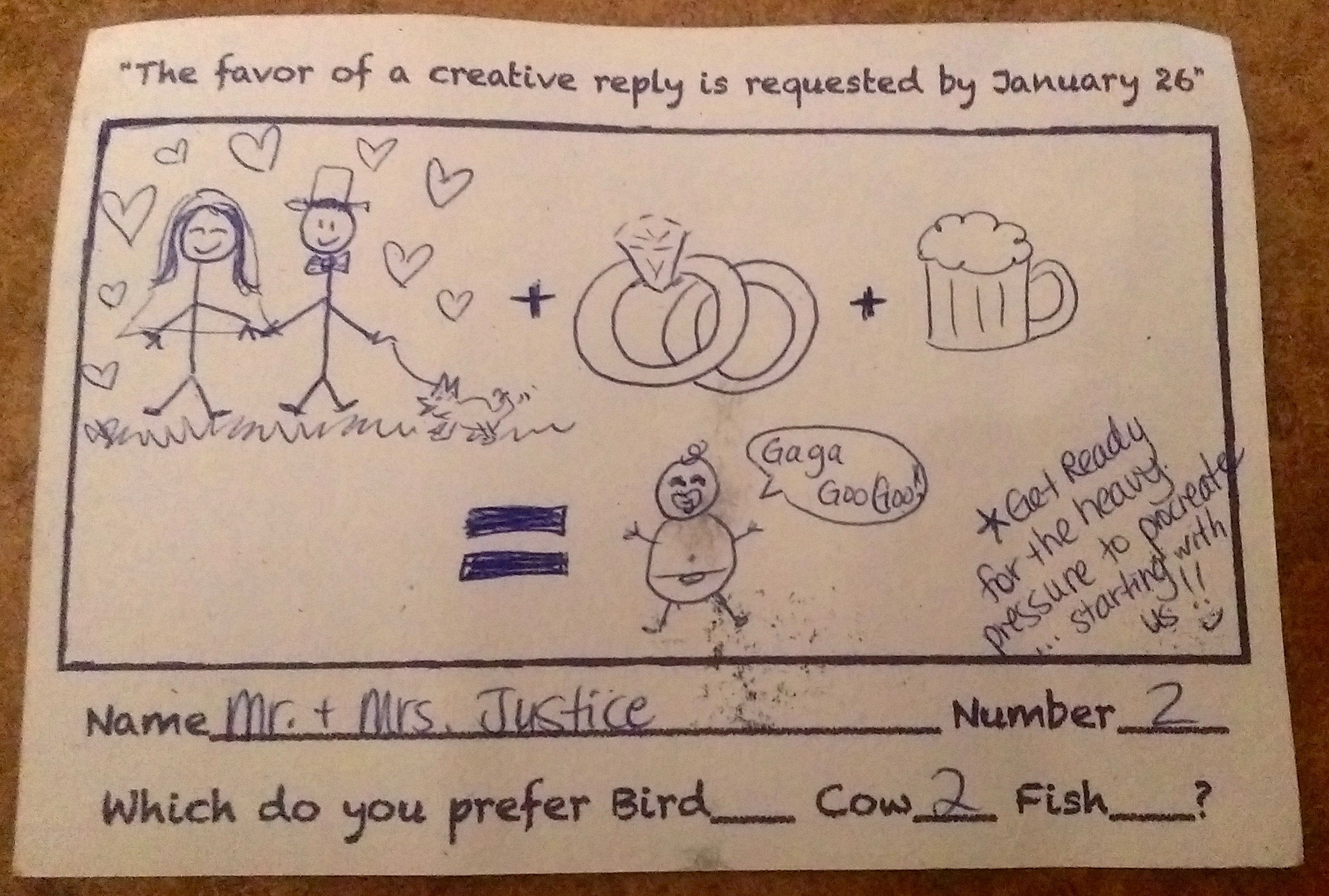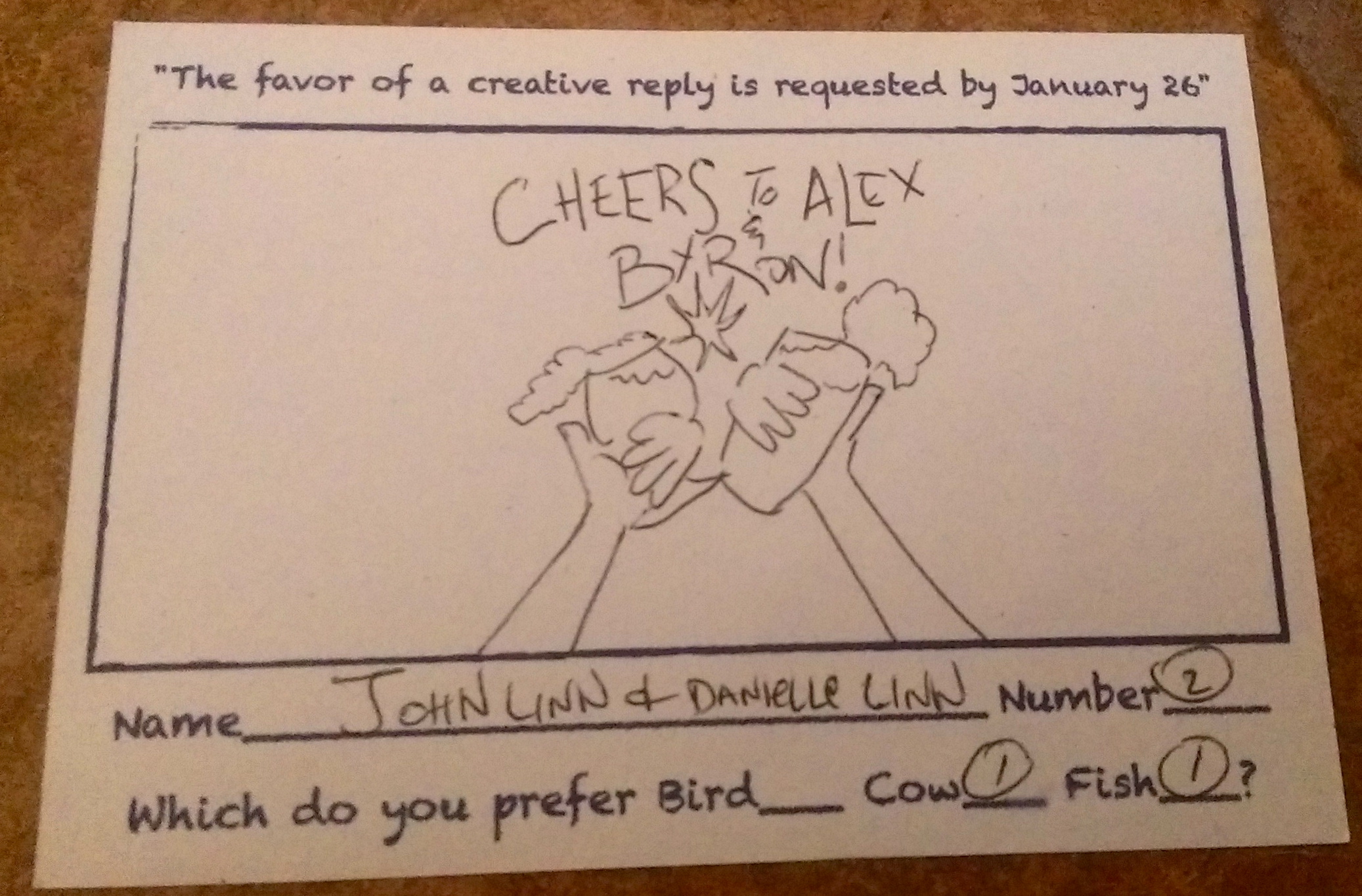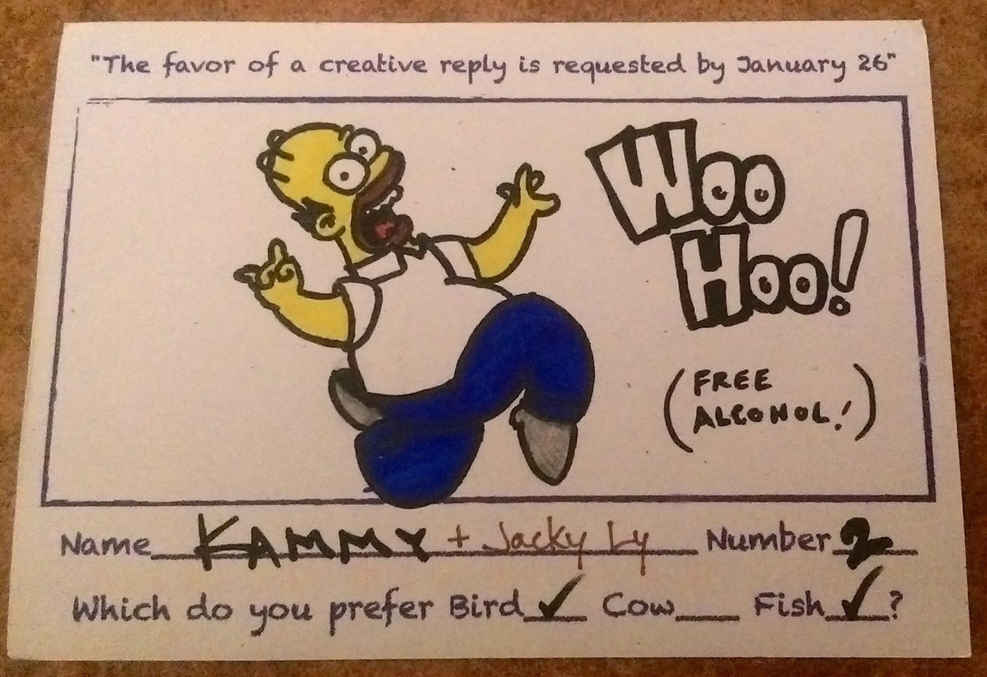 When having difficulty deciding on the illustration for the reverse side of the invitation we decided on using two of their favorites… half would be printed with the everglades gator and the other half using of the glorious Florida sunset, problem solved. Also included a details card with an illustration of the venue and a super fun RSVP post card…Alex and Byron have some very clever friends! You’ll get a smile on your face when you see their reply cards. The envelope is lined with a vintage Florida map in purple of course. Digital caligraphy addressing and a favorite quote of the bride and groom on the back of the envelope. “So, we’ll go no more a roving” Lord Byron