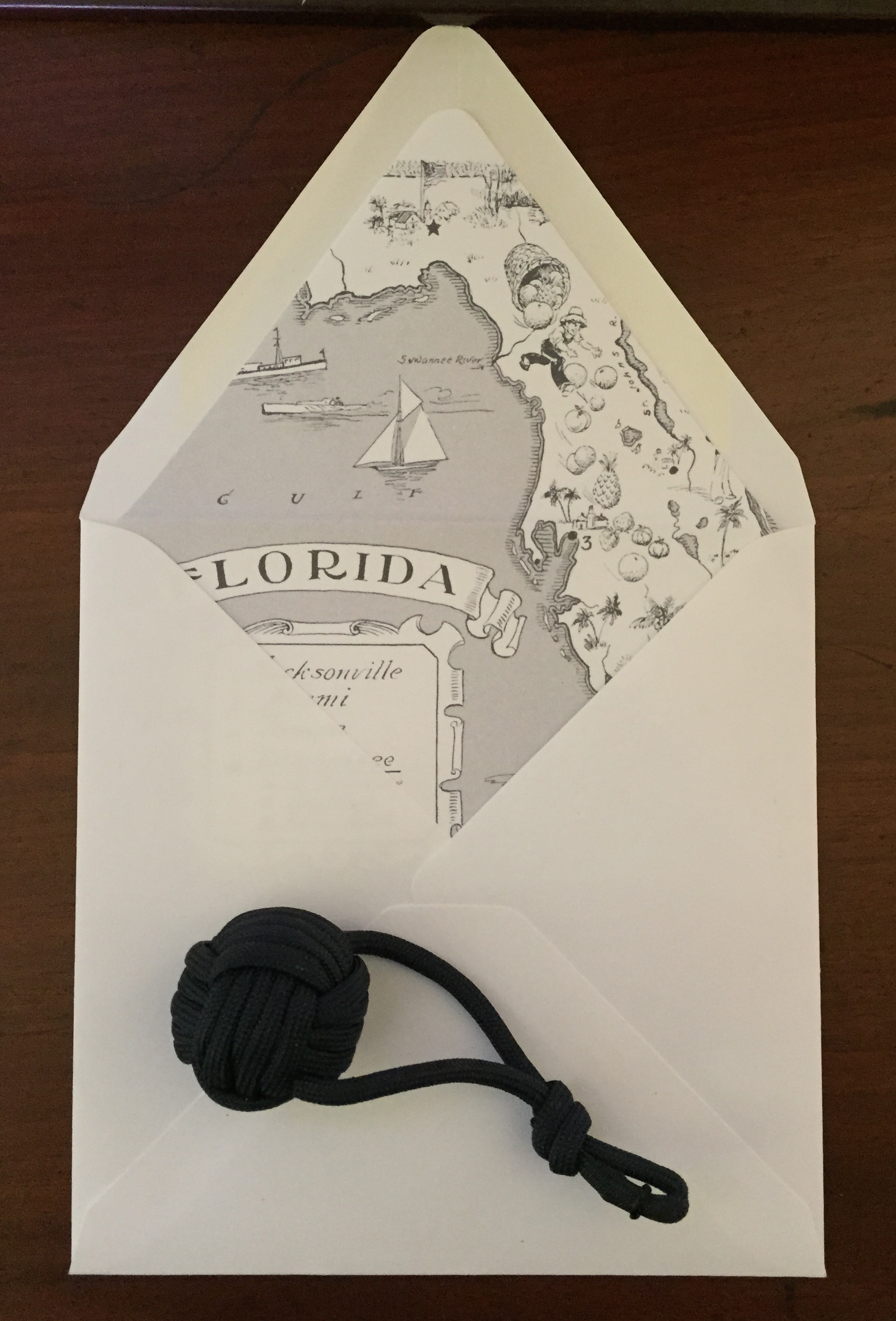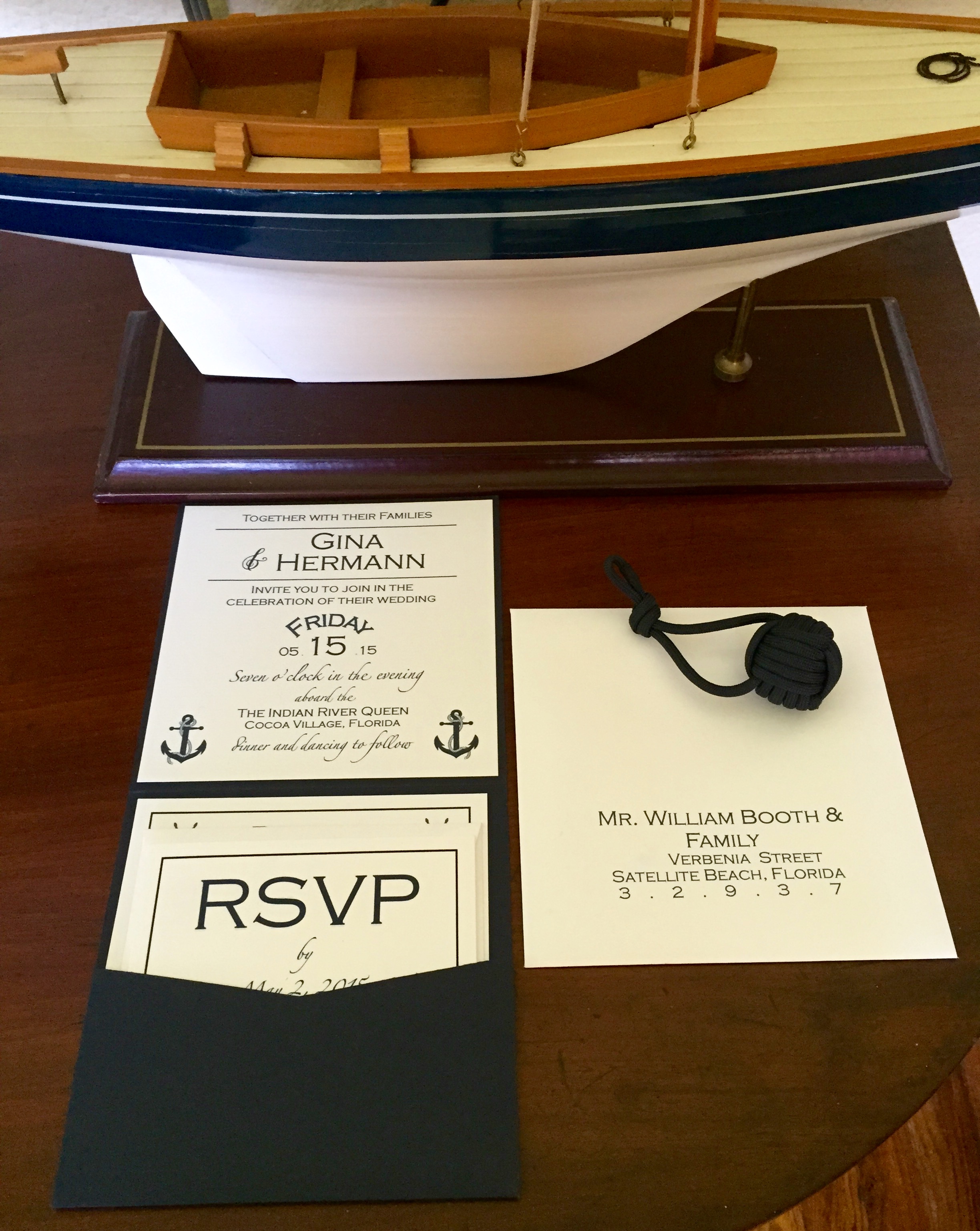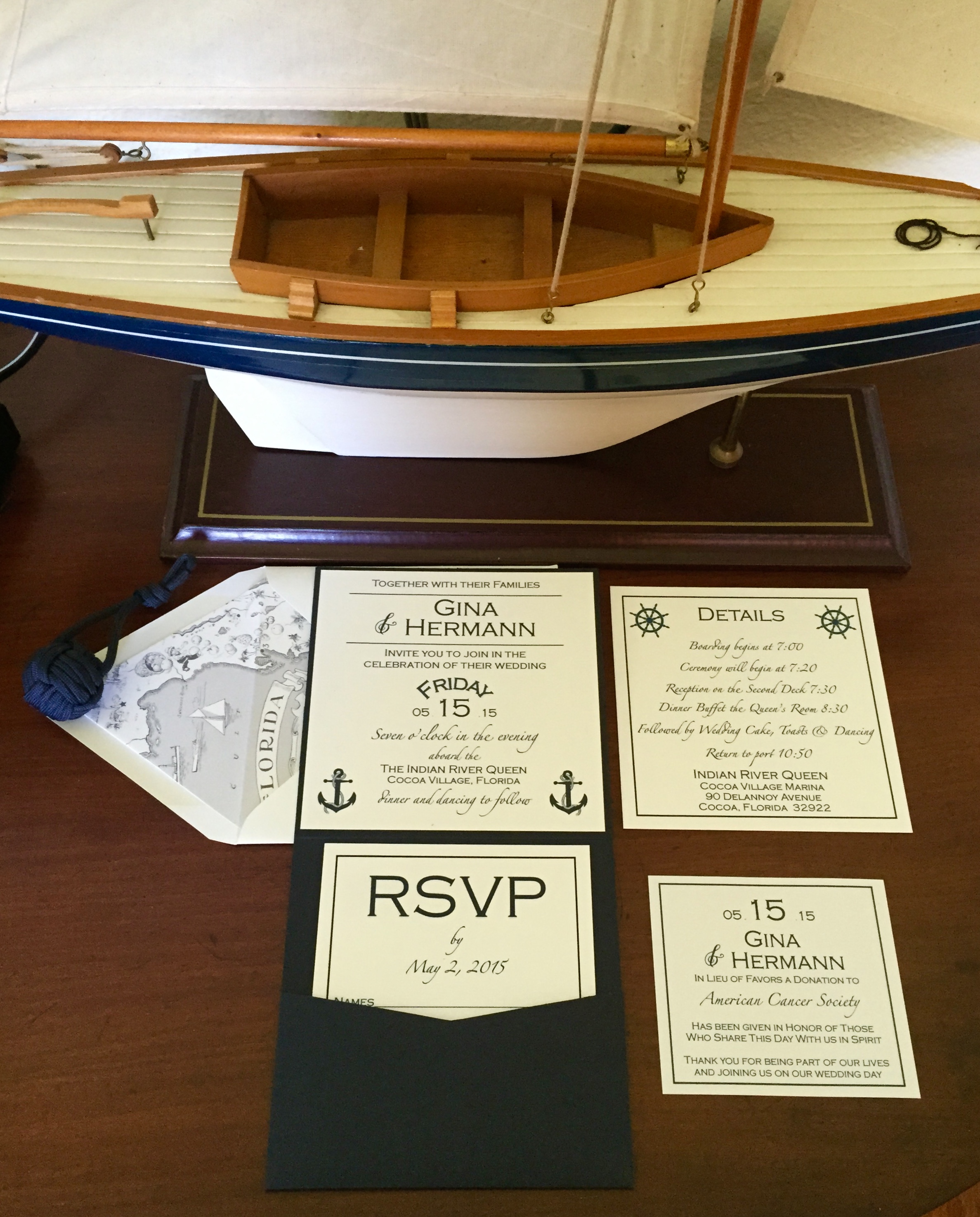Look at this Nautical Invitation Suite created for Gina and Herman’s May wedding onboard the stunning Indian River Queen, a vintage triple deck paddle wheel boat in Cocoa Village Marina. Imagine the ideal setting…a Florida sunset and view of the Indian River as the “Queen” cruises majestically along. Folded Pocket Card 5.75 X 5.75 RSVP with return envelope and the Details Card are neatly held in the pocket. Special features include a vintage Florida map envelope liner, nautical illustrations and digital addressing…Nautical perfection! In Lieu of favors the bride and groom chose to made a donation to the American Cancer Society.